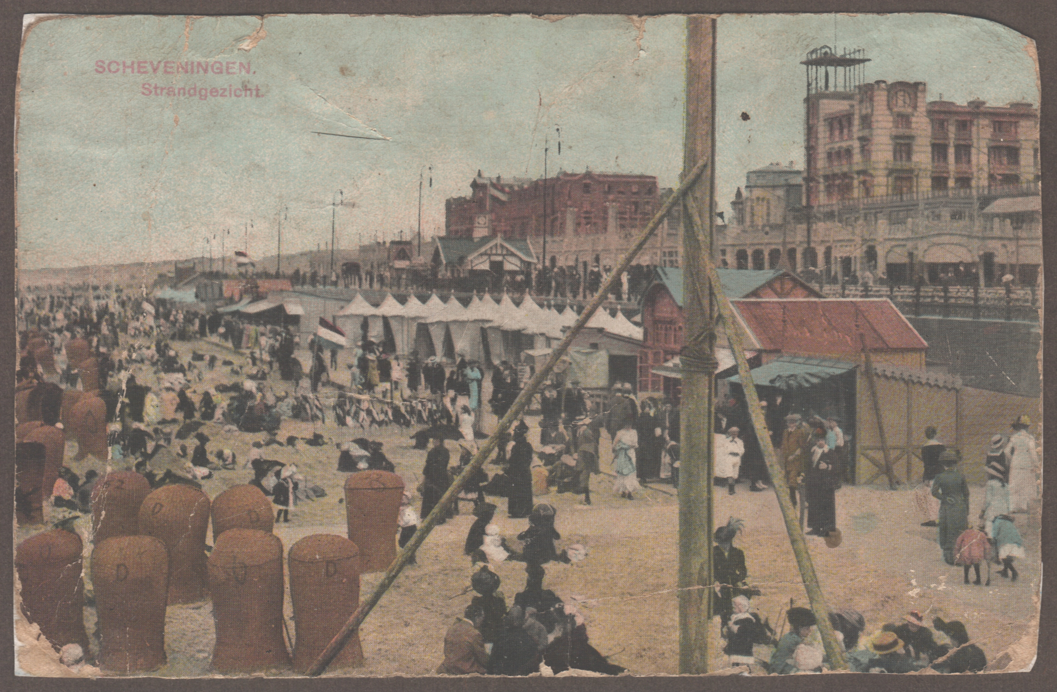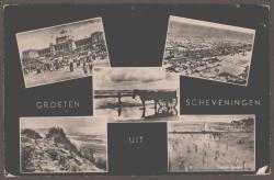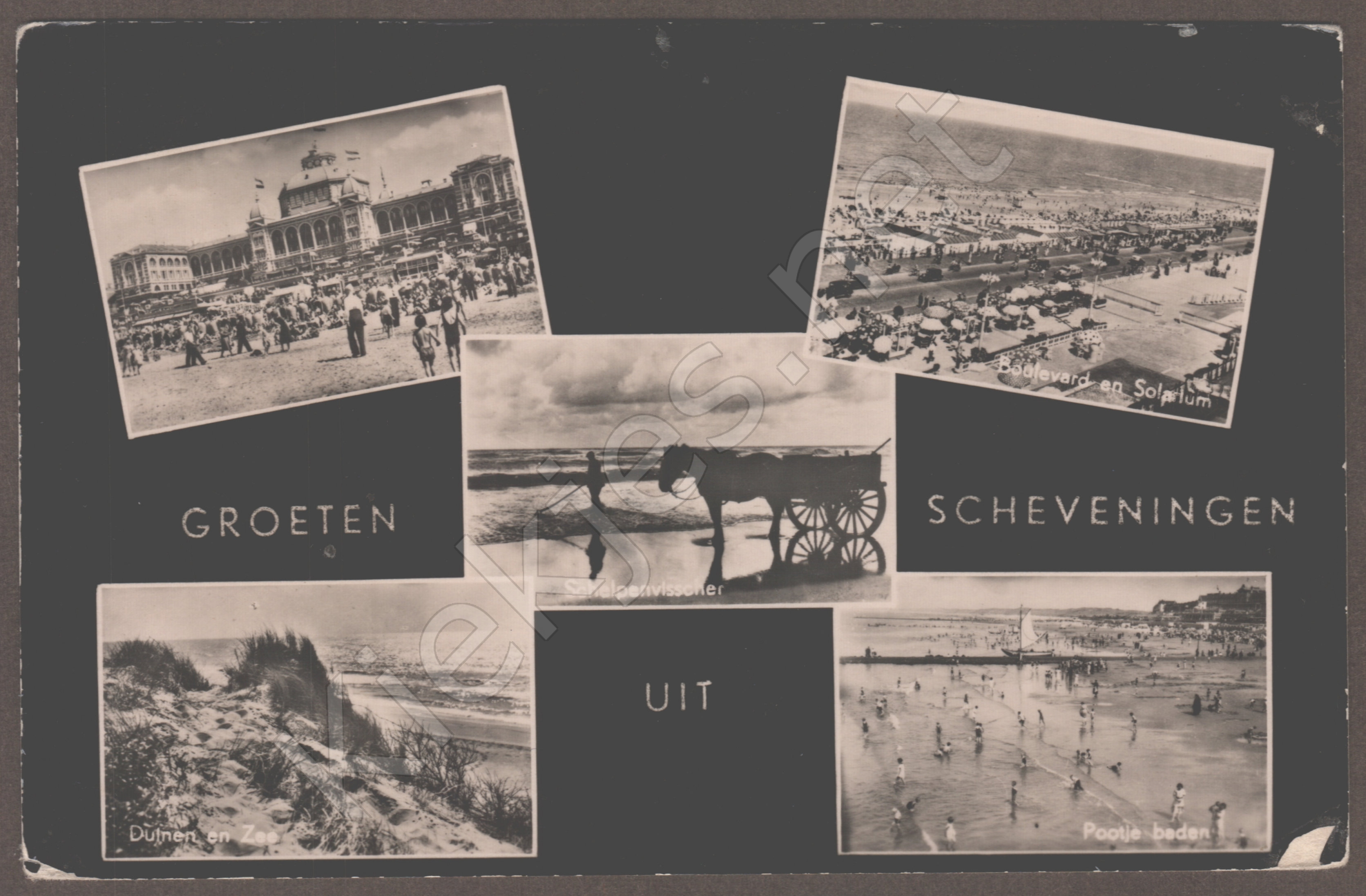 Samengestelde kaart met 5 foto's: Kurhaus, Boulevard en Solarium, Schelpenvisscher, Duinen en Zee en Pootje baden.