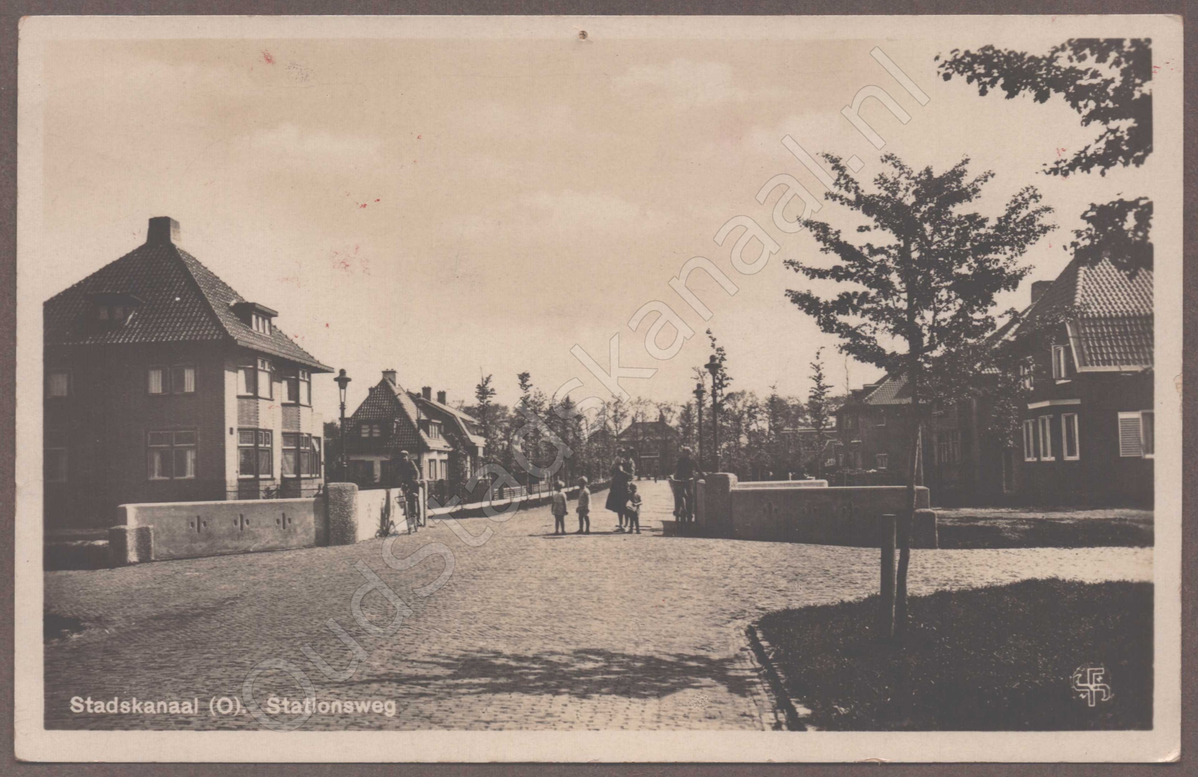 De Stationslaan, niet de Stationsweg. In het pand links zat o.a. Tandarts Oosterheerd, in het pand rechts o.a. de familie Algera. De betonnen brug over de Molenwijk is vervangen door een duiker. Van de restanten van de brug is door K.J. van Beekum, in samenwerking met leerlingen van de HBS, een kunstwerk gemaakt. Het kunstwerk bestaat helaas niet meer. Op de achtergrond het oude gemeentehuis.