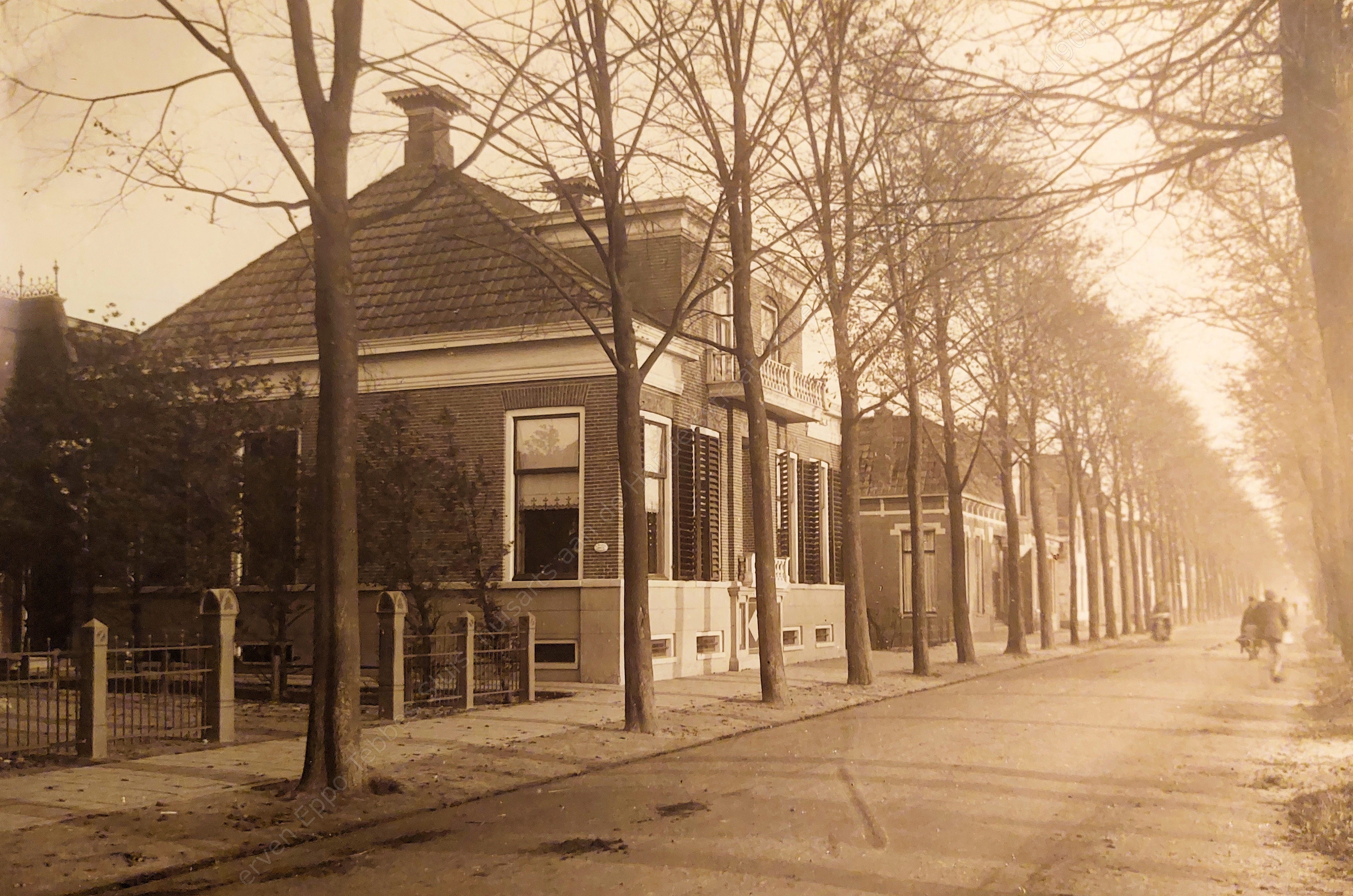 Praktijk van de Handelstraat 26. hoekkamer salon, links de ingang en de wachtkamer; achter de huiskamer. De grote villa werd gebouwd door de familie Brouwer. De volgende dokteren hebben er gewoond: E. Sluis, van der Berg, J. Jager, W.M. Rosinga en J. Roggeveen. Hier staat nu een filiaal van de Rabobank. Dan de kruidenierszaak van Stobosch, nu Géwé (tapijthal). Daarnaast woonden G. Prop (notarisklerk) en dan Jelle Berg. Het pand is afgebroken. Hier staat nu Stiekema Schilderwerken. Het hekwerk links was van de Baptistenkerk. Uit de collectie van de erven Eppo Tebbes Sluis, huisarts aan de Handelsstraat 26 te Stadskanaal, omstreeks 1900.